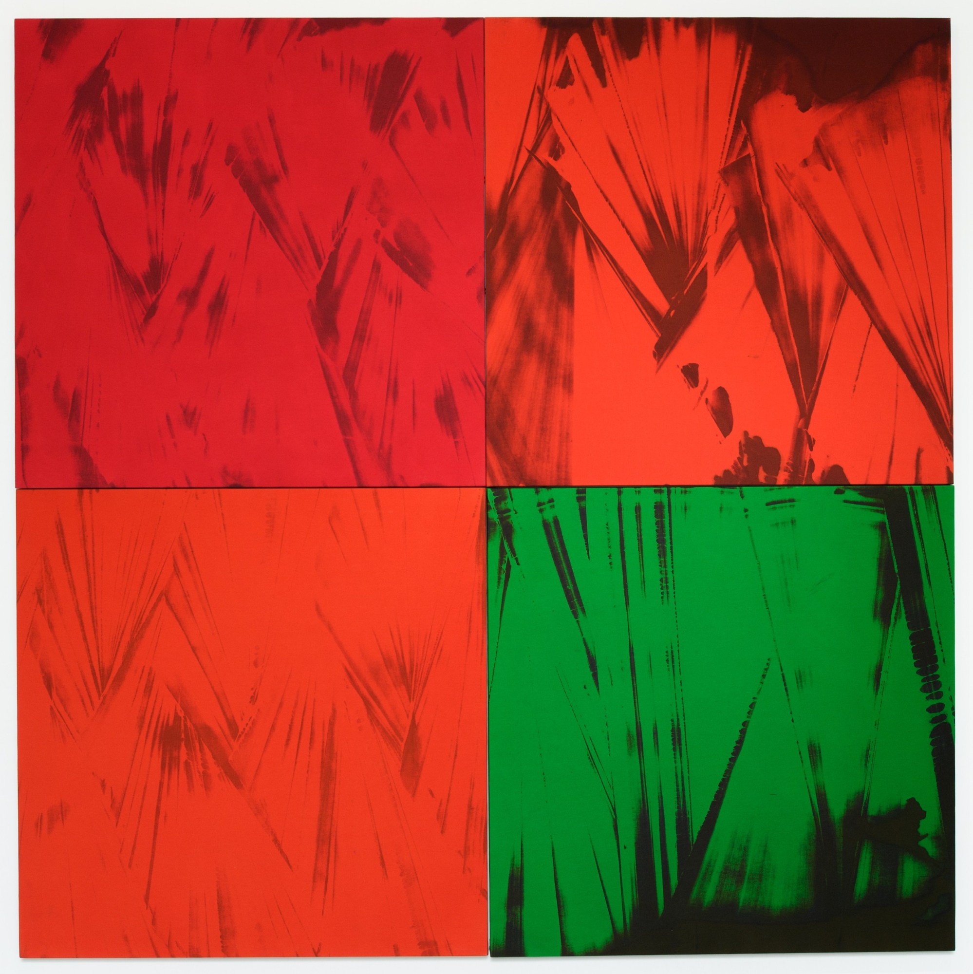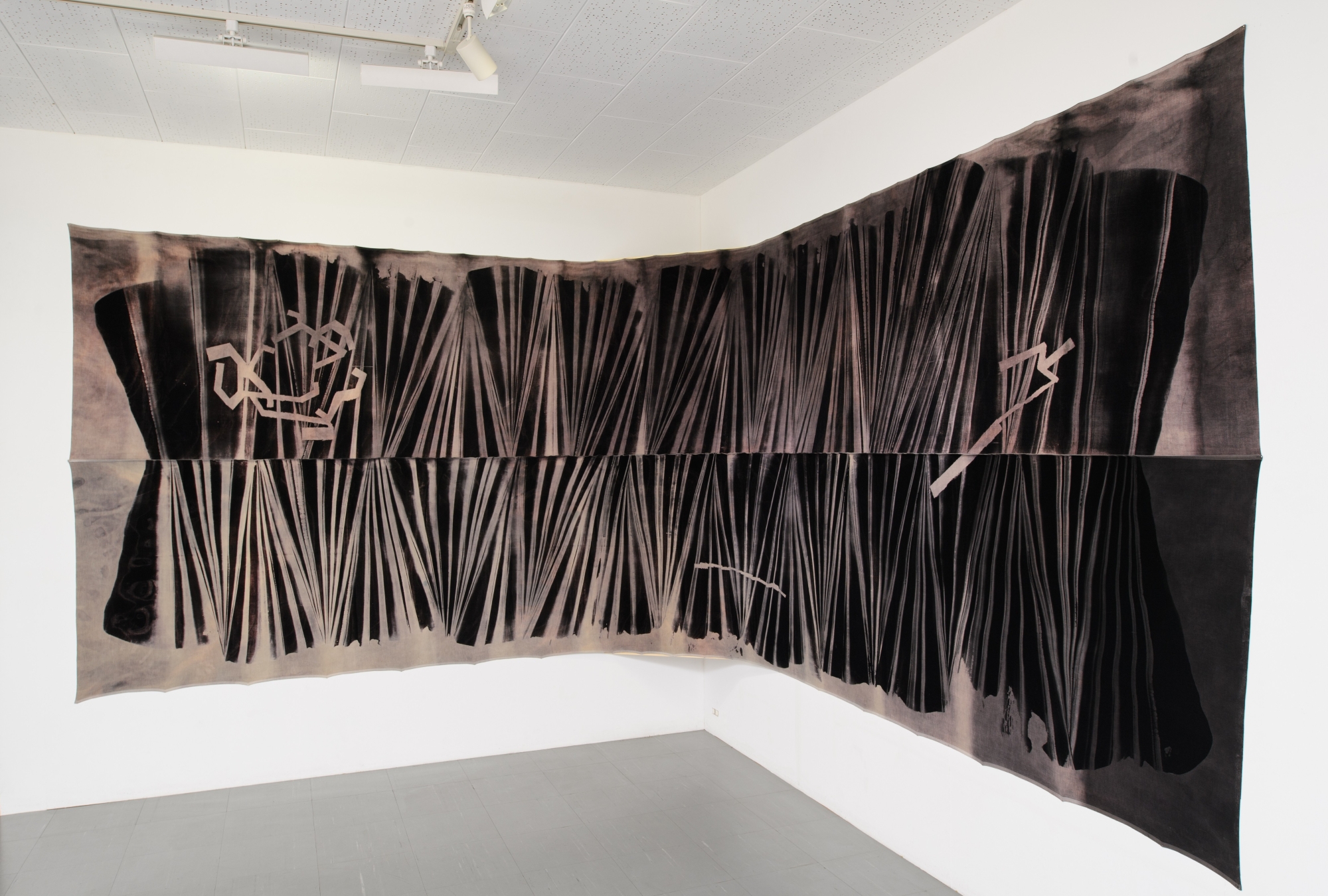 本展では、「Strokes」シリーズの最新作を中心に展開します。当シリーズは、布の上に置いた大量の防染糊をシルクスクリーンのスキージで引き摺った後に、染色または脱色でその痕跡を露呈させる表現として制作を始めました。現在に至るまでも、当シリーズは随時新たな要素を加えながら制作を重ね、また他のシリーズの制作にも部分的に応用・活用することもある、彼にとってはライフワークの一つと言える表現です。また当シリーズは、彼が作家活動を始めた当初の表現手法でもあり、また10m以上の布を用いた大作で発表することが多かったことから、彼の活動を若い頃から知る方々にとっては、彼の代表的な表現の一つとして認識されています。
