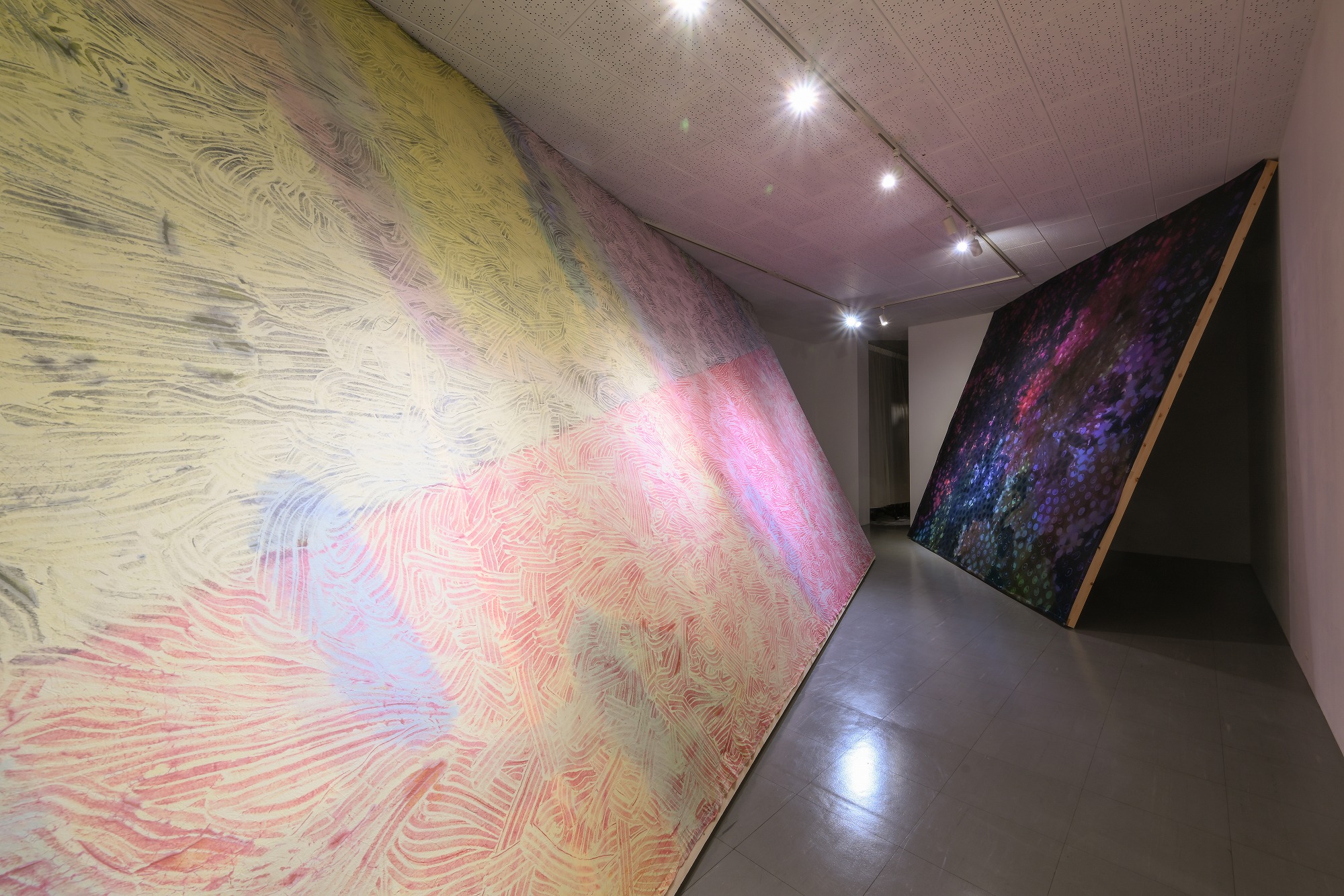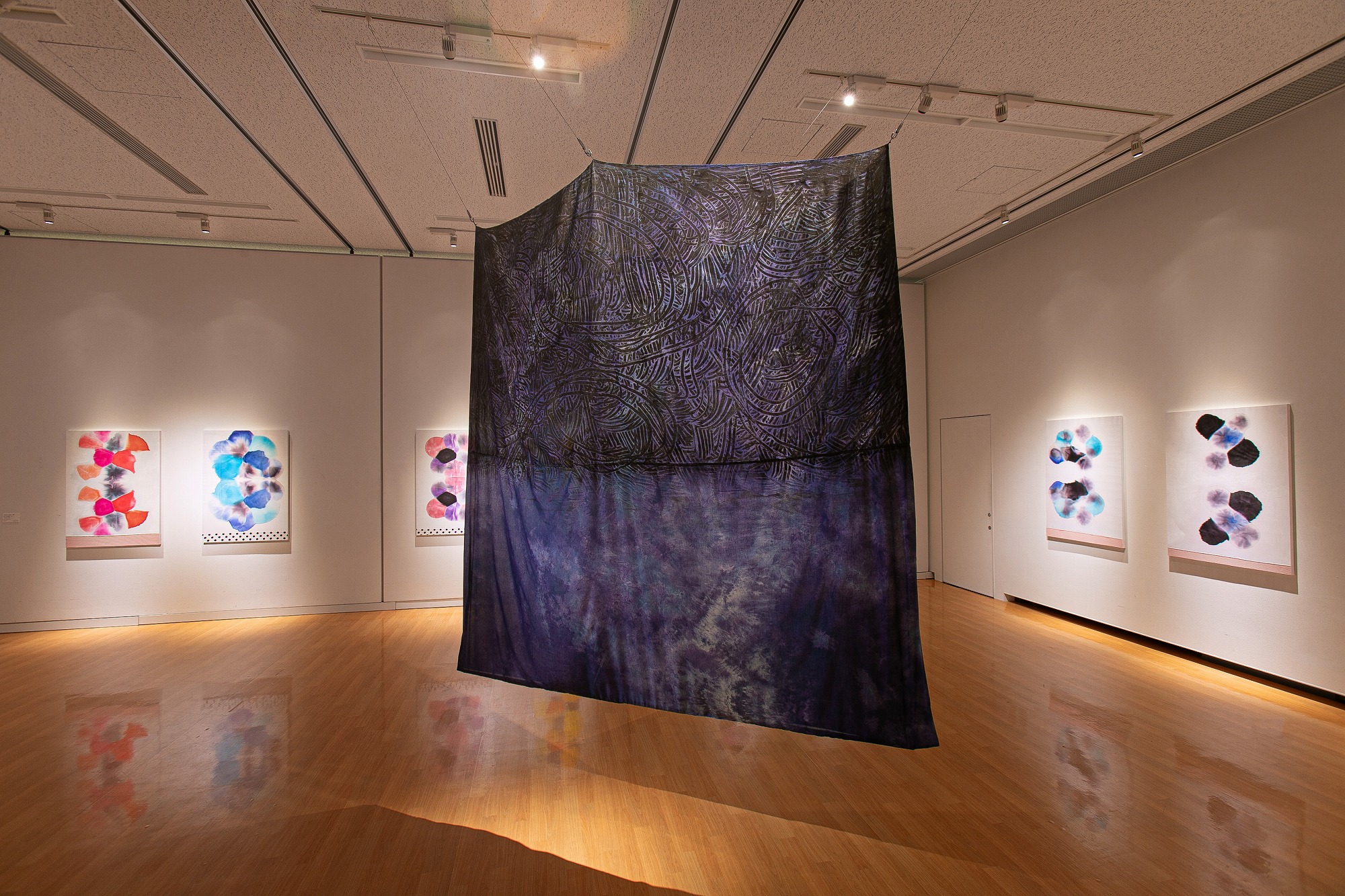 加賀城は、染色の手法を軸に、工芸と美術の狭間を探究する表現に一貫して取り組み続けています。2022年に弊廊で開催した前回の個展「Manipulation / Interchange」では、染色の技術における自力と他力の手法の対比と、布の特性を様々な形状や展示方法で強調した発表を前後期に分けておこないました。さらに昨年2024年の年末から今年の年初にかけて、富山の小矢部市美術館・アートハウスおやべにて開催した個展「一つのメルヘン」では、全長25mの作品をはじめとした長大な布に多様な染色表現を施した作品群などで構成し、彼にとって過去最大規模の作品発表となりました。近年の彼の制作では、新たな染色の技術や材料の知識を積極的に取り入れつつ、これまでに習得した様々な技法や展示手法を混交させながら、染色表現のさらなる拡張を推し進めることを志向しています。